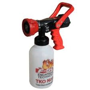 The new F-500 EA “Turbo Knockdown and Overhaul” (TKO) Nozzles carry F-500 Encapsulator Agent to deliver extreme knockdown power. The F-500 EA encapsulates the fuel, cools the fuel and surrounding structures and interrupts the free radical chain reaction. Any one of these three elements can extinguish a fire. Under the nozzle, is a 2 liter (.52 gallon) container that instantly educts a proportioned amount of F-500 EA into the water stream. The nozzles are available with flow rates of 75 liters per minute (20 gpm) or 130 liters per minute (35 gpm). The nozzles are adjustable for streaming or fog pattern and the proportioning rate can be easily changed. If more F-500 EA is needed, a new bottle can be quickly replaced. The hose connection is a standard 1 ½” NH-NST fitting.