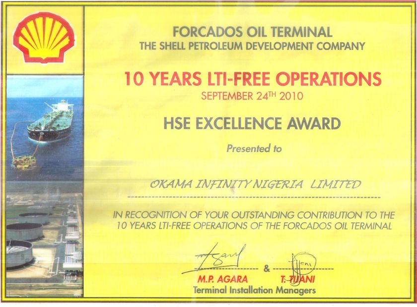 10 years Safety Award of Excellence – Accident Free, presented to the MD/CEO Okama Infinity Nigeria Limited by